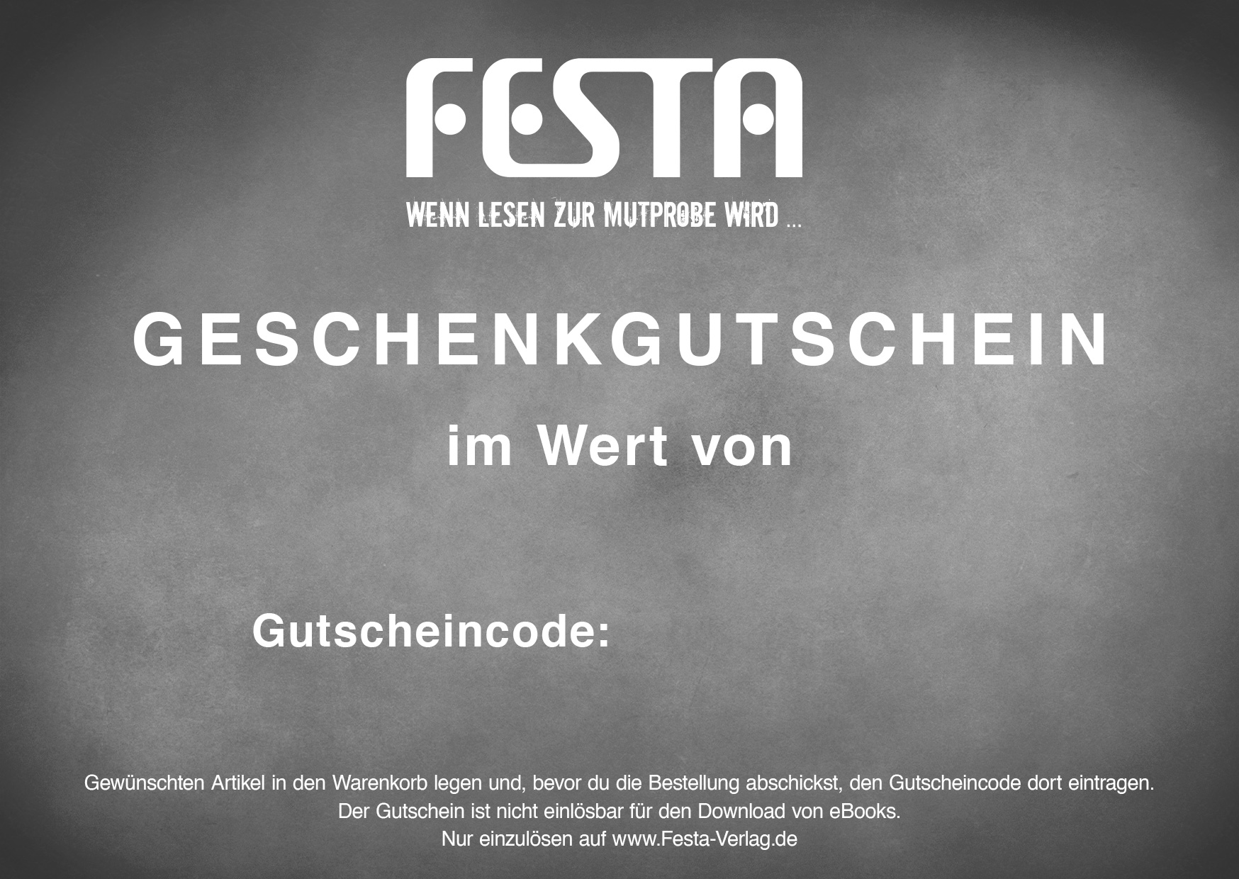 Lege den Gutschein mit dem gewünschten Wert in den Warenkorb. Nach der Bezahlung (nur PayPal oder Amazon Pay möglich) erhältst Du dann Deinen persönlichen Gutschein als PDF-Datei zum Ausdrucken in DIN A6 Größe und zum Verschenken. Der Gutschein ist nicht einlösbar für den Kauf von eBooks.Zusatzinformation